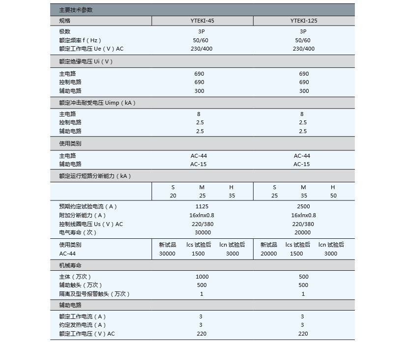 YTEKI控制與保護(hù)開關(guān)電器主要用于交流50Hz(60Hz)、額定電壓至690V、額定電流自0.16A至125A的電力系統(tǒng)中,能夠接通、承載和分?jǐn)嗾l件下包括規(guī)定的運(yùn)行過載條件下的電流,且能夠接通、承載并分?jǐn)嘁?guī)定的非正常條件下的電流,如短路電流。