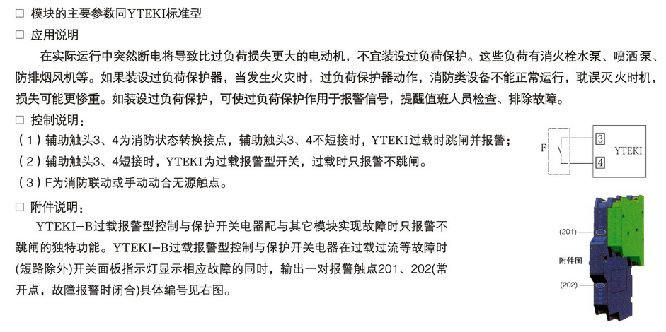 YTEKI-B過載報警型控制與保護(hù)開關(guān)電器主要用于交流50Hz(60Hz)、額定電壓至690V、額定電流自0.25A125A的消防系統(tǒng)中,能夠接通、承載正常條件下包括規(guī)定的過載、過流條件下的電流。實現(xiàn)“只報警、不跳閘”的功能;且能夠接通、承載和分?jǐn)喾钦l件下的電流(如短路電流),實現(xiàn)“報警+跳閘”的功能。