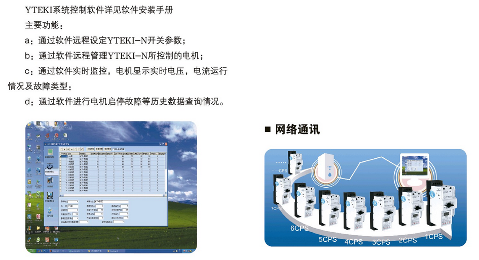 YTEKI-N通訊型 控制與保護開關(guān)電器適用于遠程通訊,運行于WINDOWS9X/NT/XP操作環(huán)境下的GUT人機交互系統(tǒng)。提供標準的RS485通訊接口,在接口模塊的上位機連接端備有高速光電隔離,提高了抗干擾能力。支持與Modbus-RTU,Profibus-DP等多種協(xié)議通訊,且通訊距離可達1200米。系統(tǒng)可同時對多達255臺電動機的各種參數(shù)進行修改、設(shè)定、數(shù)據(jù)傳輸、數(shù)據(jù)記錄及顯示電動機動態(tài)工作參數(shù)。