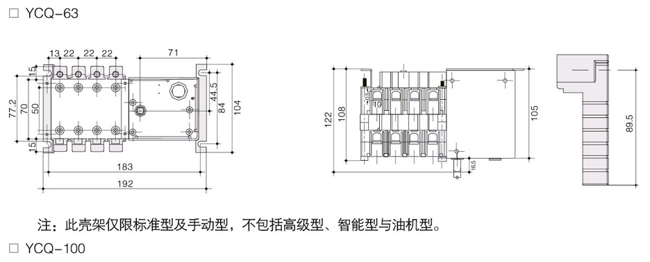 YCQ系列雙電源自動轉(zhuǎn)換開關(guān)的最小體積為192mm×104mm×108mm,重量僅2.3kg,大大節(jié)約了其所需的柜體尺寸,特別適用于現(xiàn)代化建設中的供電系統(tǒng)。