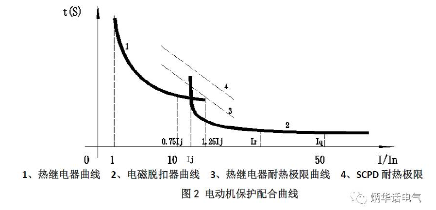 因此,電動機的保護需要配合嚴密,不留死角,否則會造成設(shè)備或器件損壞。電動機保護的配合可以用圖2直觀的表示。圖中1是熱繼電器曲線,用于過載保護;2是電磁脫扣器曲線,用于短路保護;3和4分別是熱繼電器耐熱極限曲線和SCPD耐熱極限;Ij為熱繼電器脫扣曲線與SCPD電磁脫扣曲線的交點,由熱繼電器廠家提供。理想的保護配合和分工如表1所示,這樣短路保護電器和過載保護電器分工明確,各司其職。
