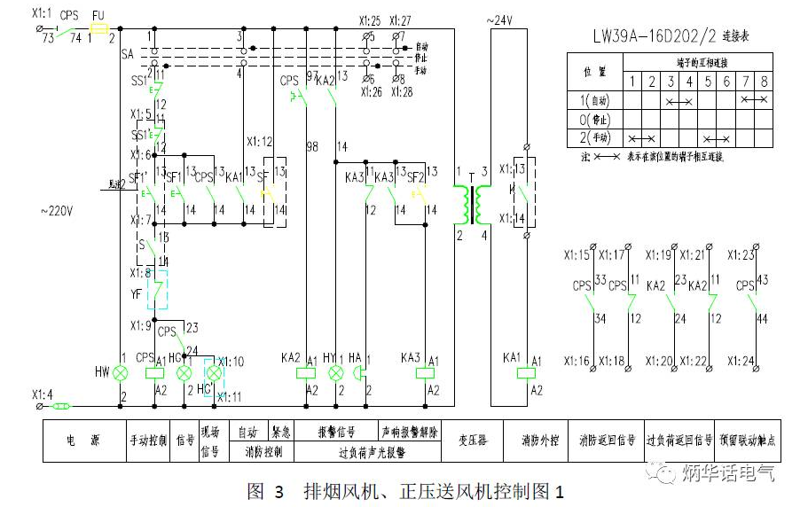 圖3是排煙風(fēng)機和正壓送風(fēng)機控制圖,其主回路參見圖1b,為CPS方案,適合于交流380V單臺消防排煙風(fēng)機或正壓送風(fēng)機的現(xiàn)場控制或兩地控制,過載保護只報警,風(fēng)口(或風(fēng)閥)上的微動開關(guān)直接與風(fēng)機聯(lián)動,消防聯(lián)動模塊提供無源動合觸點,當(dāng)消防系統(tǒng)提供有源觸點時,取消變壓器T。只有現(xiàn)場控制時,取消SS1'、SF1'、S、HG'并將X1:5與X1:6短接,X1:6與X1:7斷開,X1:7與X1:8短接,X1:10與X1:11斷開。圖中CPS包含線圈、過載保護觸點,動合觸點、動斷觸點。用于正壓送風(fēng)機控制時,將X1:8與X1:9短接。
