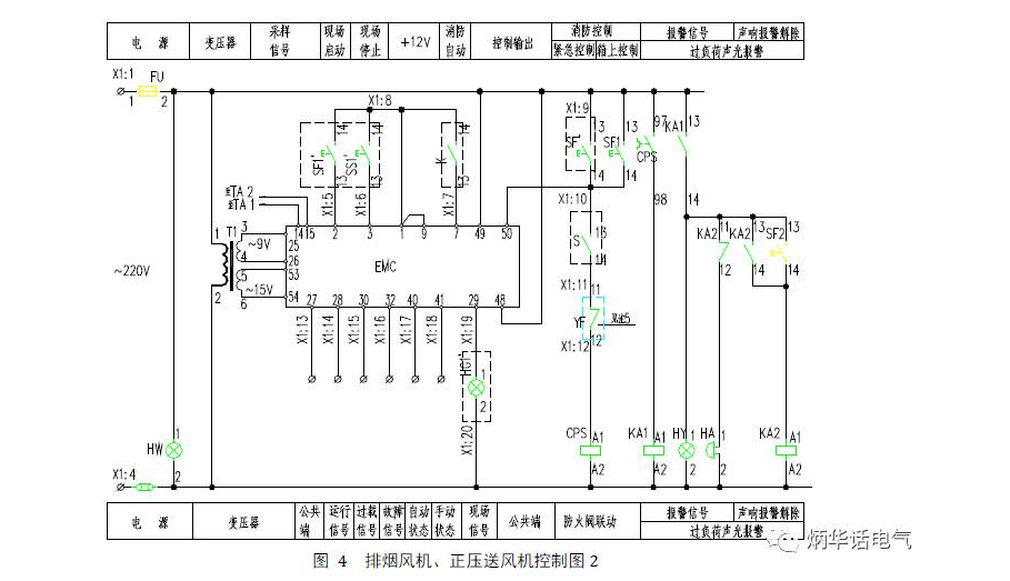 圖4是排煙風(fēng)機和正壓送風(fēng)機另一個控制方案,適合于交流380V單臺消防排煙風(fēng)機或正壓送風(fēng)機的現(xiàn)場控制或兩地控制,控制電源為交流220V,過載只報警不作用于斷電,風(fēng)口(或風(fēng)閥)上的微動開關(guān)直接與風(fēng)機聯(lián)動,消防聯(lián)動模塊提供無源動合觸點,當(dāng)消防系統(tǒng)提供有源觸點時,取消變壓器T。只有控制箱上控制時,取消SS1'、SF1'、S、HG1'。圖中CPS包含線圈、過載保護觸點、動合觸點、動斷觸點?刂破EMC是風(fēng)機專用控制模塊,其面板上有風(fēng)機的啟停控制及相關(guān)信號,詳見《常用電機控制電路圖》10D303-2相關(guān)頁碼。當(dāng)本圖用于正壓送風(fēng)機控制時,將X1:11與X1:12短接。