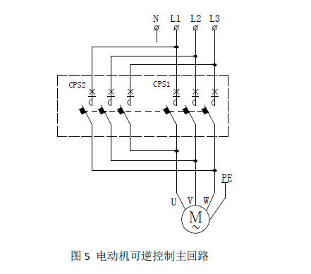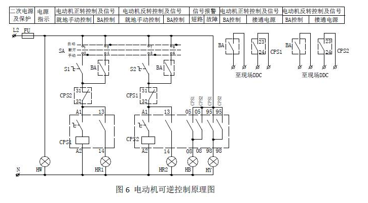 圖5和圖6分別為CPS組成的電動機可逆控制的主回路和二次原理圖,CPS1、CPS2分別控制電動機正轉(zhuǎn)和反轉(zhuǎn)的線圈,集成在CPS內(nèi),類似分立元件構(gòu)成電動機主回路中的接觸器,CPS本身具有機械聯(lián)鎖功能,正反轉(zhuǎn)的動斷觸點分別串聯(lián)在對方的線圈回路,形成電氣聯(lián)鎖。本方案還具有BA自動控制功能。